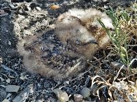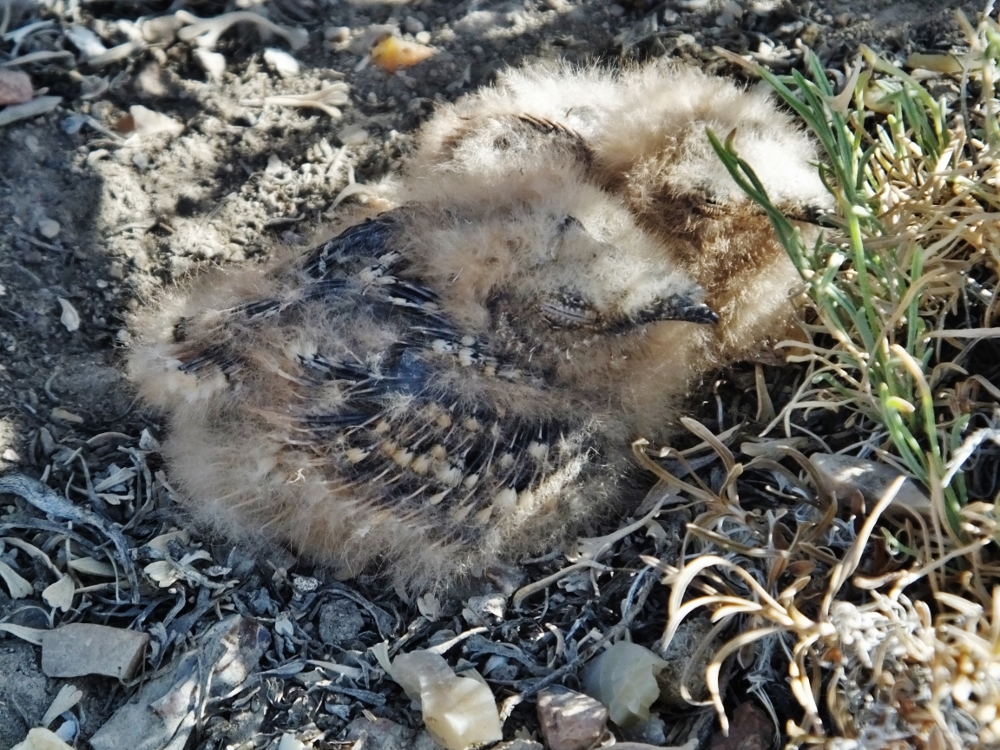 Two fluffy bird chicks hide beneath a sage brush while the mother was frightened away by our presence