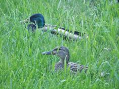 A mallard couple made themselves at home on our front lawn.