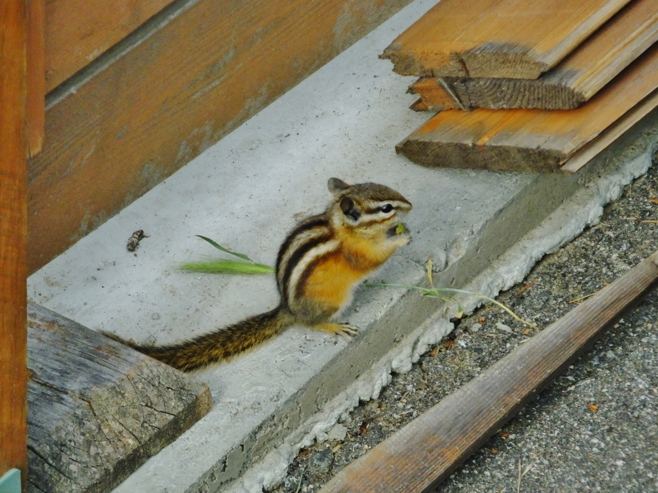 A chipmunk inspects the retaining wall and fence repairs by our home