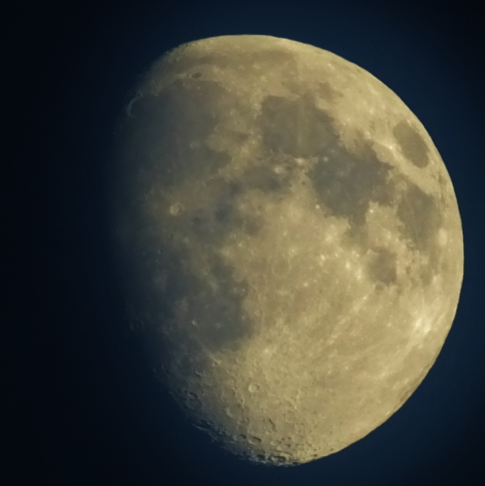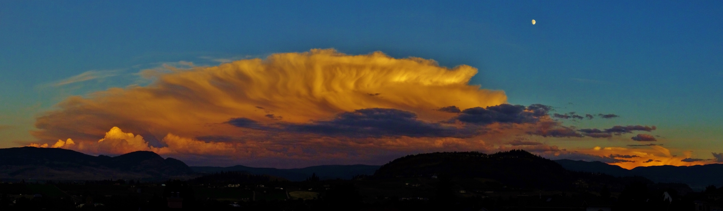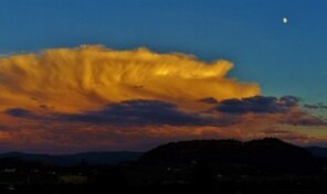 Colourful sunset clouds over distant mountains viewed from home (left) and a close-up of the moon at the same time. (right)
