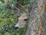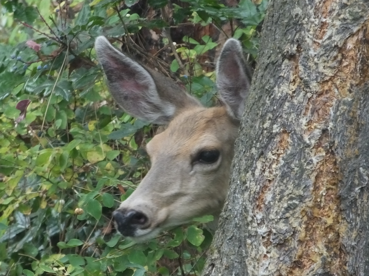 A doe gazes at me from behind a tree as it browses fresh leaves in our back yard. (right)