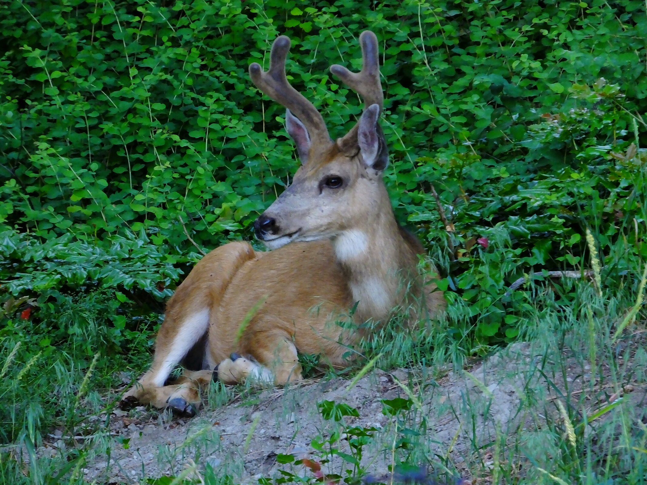 This picture shows a young buck resting in our back yard a couple of days ago. The deer seem to like coming here occasionally to feed and rest.