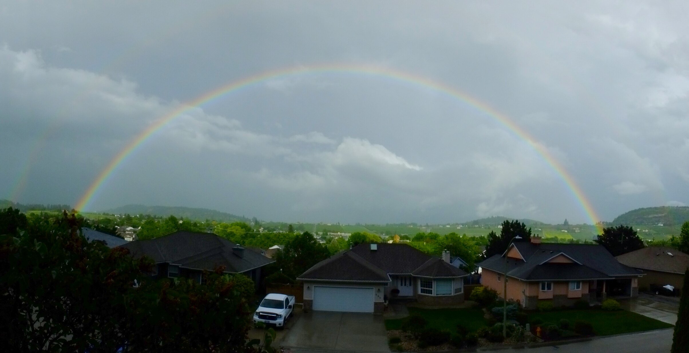 A rainbow appeared over the valley in front of our home this evening.