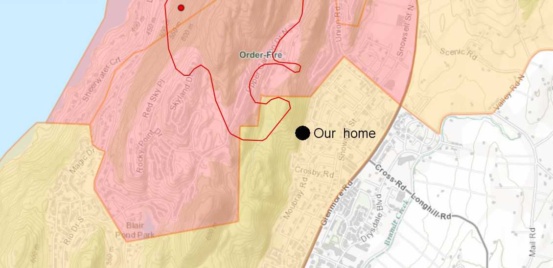 Our home is now in the alert area Map as of ~noon 20 August Red lines define burned areas Red background defines evacuation areas - orange is alert areas